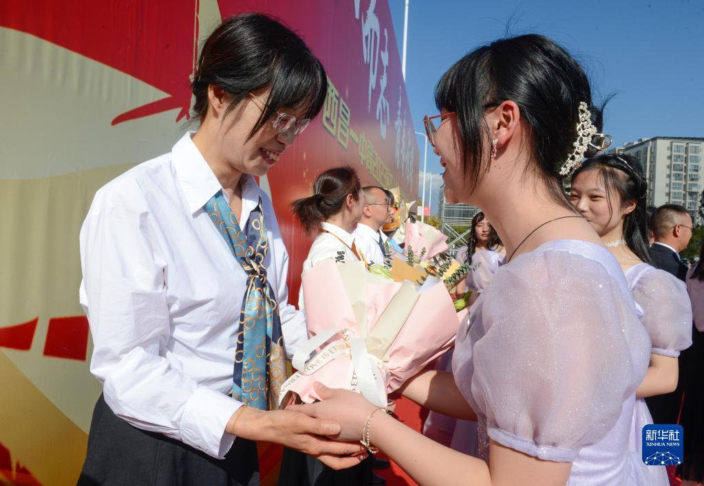 4月2日,在西昌一中成人禮上,高三學(xué)子向老師獻花。