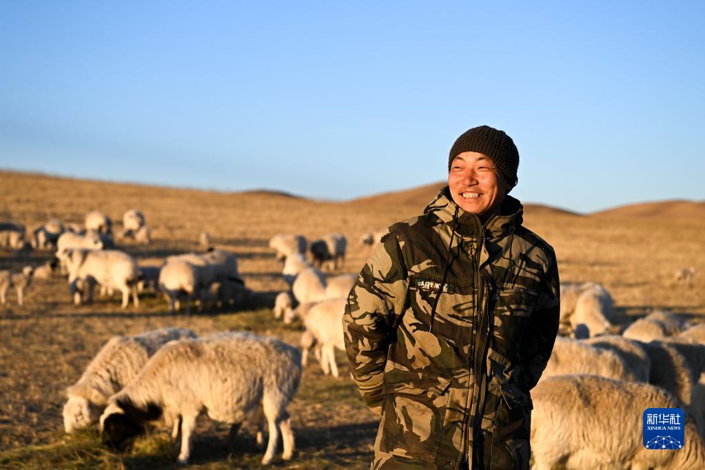 3月29日,朝克德力根站在草場(chǎng)的羊群之中露出笑容。