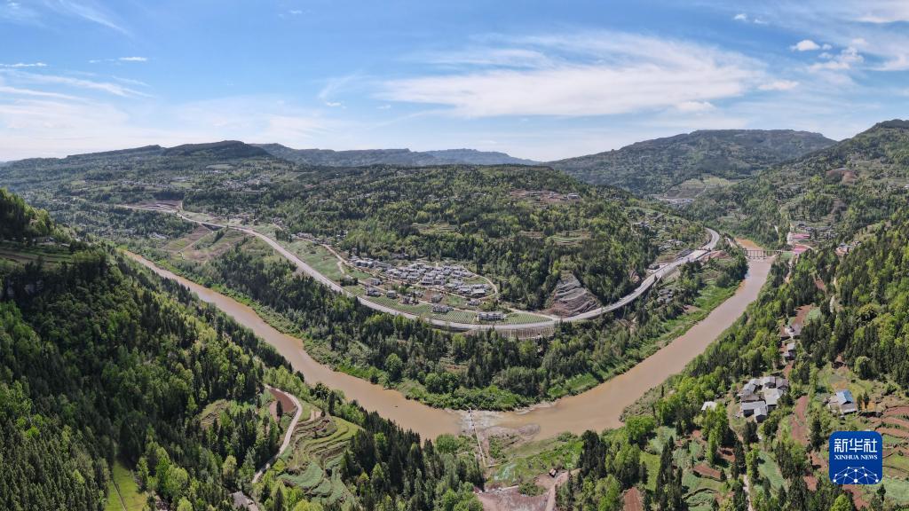 這是4月4日拍攝的鎮廣高速公路王坪至通江段王坪高速出口前往川陜革命根據地紅軍烈士陵園的道路(無(wú)人機全景照片)。