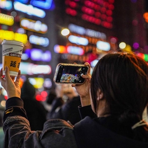 4月4日,游客們手拿咖啡在延吉市打卡拍照。