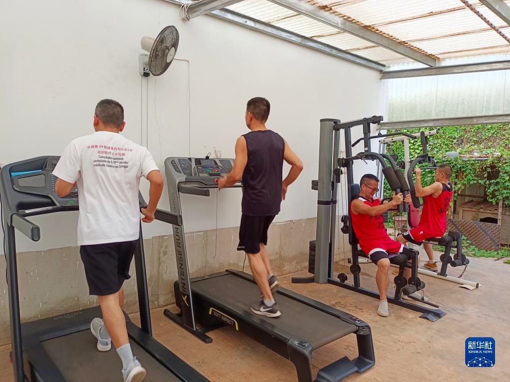 3月26日,中國第19批援塞內加爾醫療隊隊員在位于塞內加爾迪亞姆尼亞久兒童醫院附近的駐地進(jìn)行體育鍛煉。