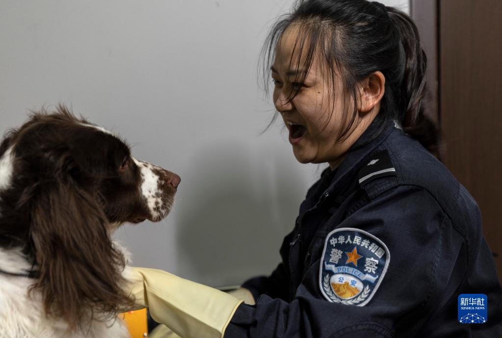 4月3日,劉欣給警犬康欣洗澡后吹干。新華社記者 費茂華 攝