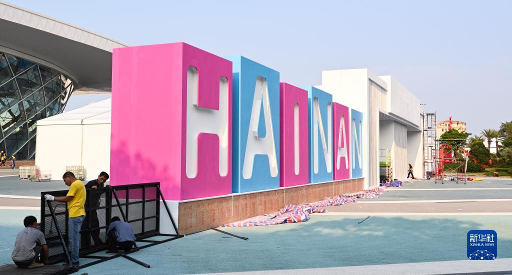 工人在海南國際會(huì )展中心外作業(yè)(4月4日攝)。
