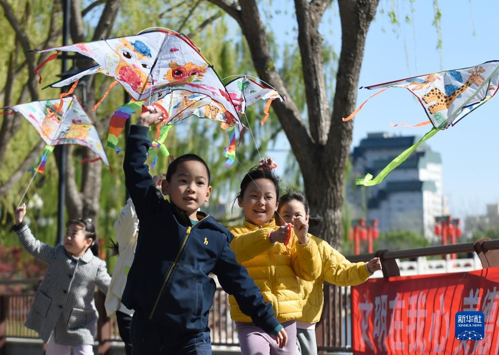 4月7日,小朋友在北京陶然亭公園放風(fēng)箏。