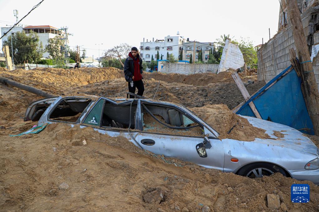 4月7日,一名男子在加沙城查看以色列軍隊空襲后的車(chē)輛殘骸。