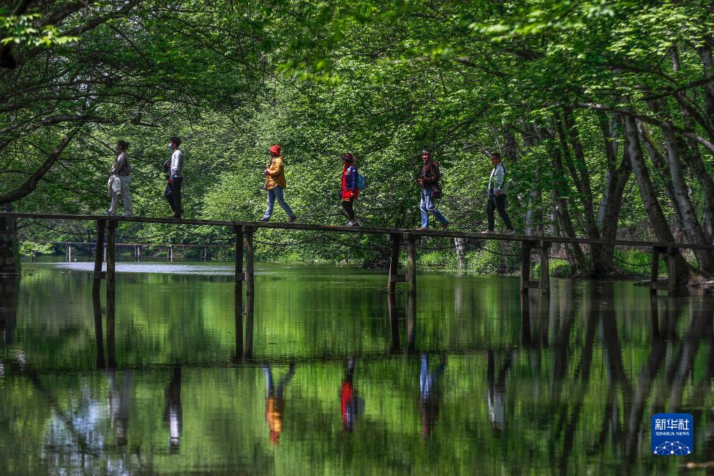 4月7日,游客在黃山市徽州區西溪南濕地踏青賞景。