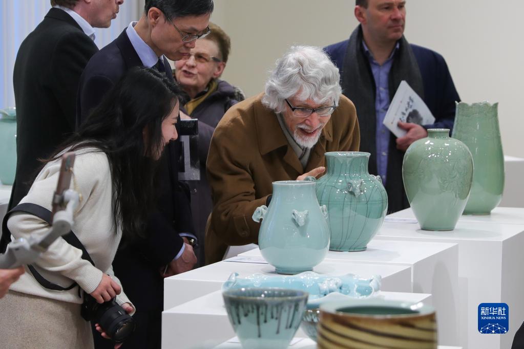 4月3日,在比利時(shí)布魯塞爾,參觀(guān)者在“聽(tīng)瓷語(yǔ) 觀(guān)世界——宋韻龍泉青瓷展”上觀(guān)賞瓷器。