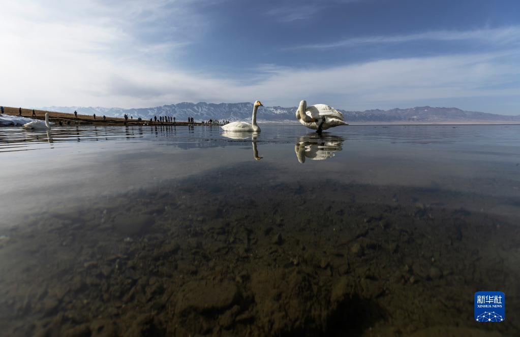 4月6日,兩只天鵝在賽里木湖休憩。