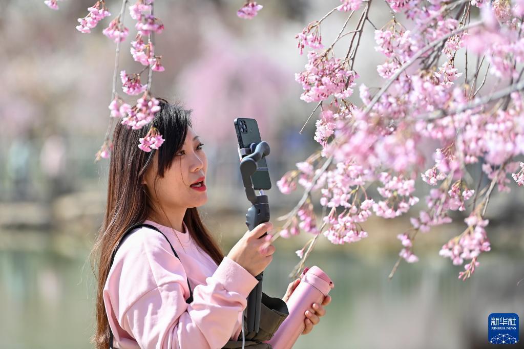 4月8日,一位游客在玉泉山城郊森林公園的櫻花園里直播。