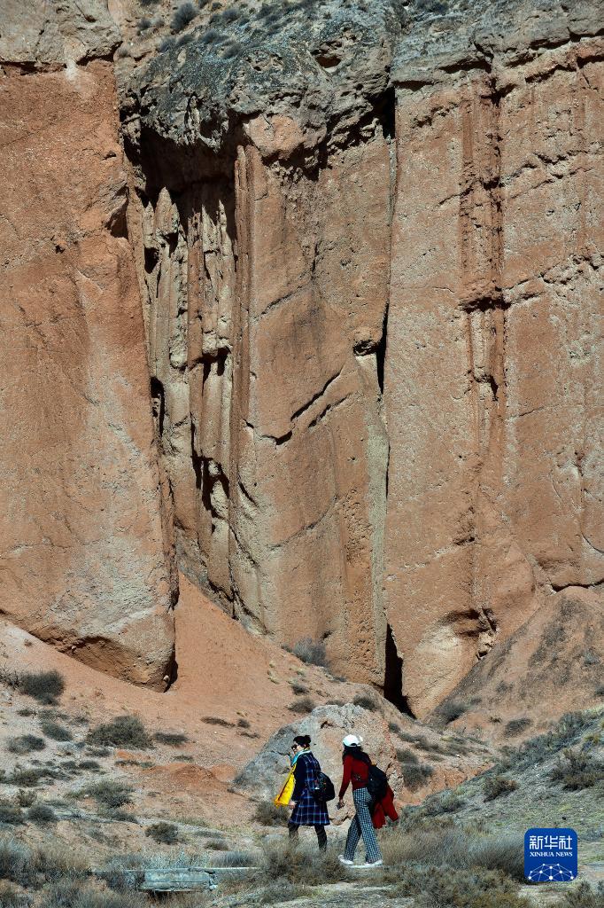4月8日,游客行走在青海貴德國家地質(zhì)公園丹霞地貌間。