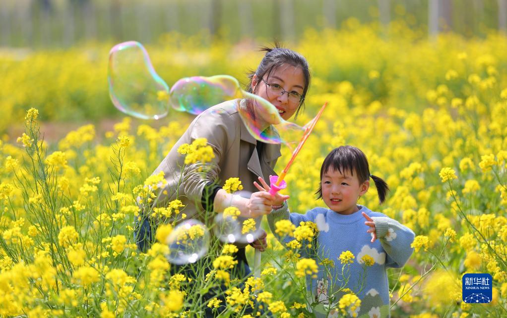 4月9日,家長(cháng)帶著(zhù)孩子在山東省滕州市洪緒鎮一處油菜花田里玩耍。