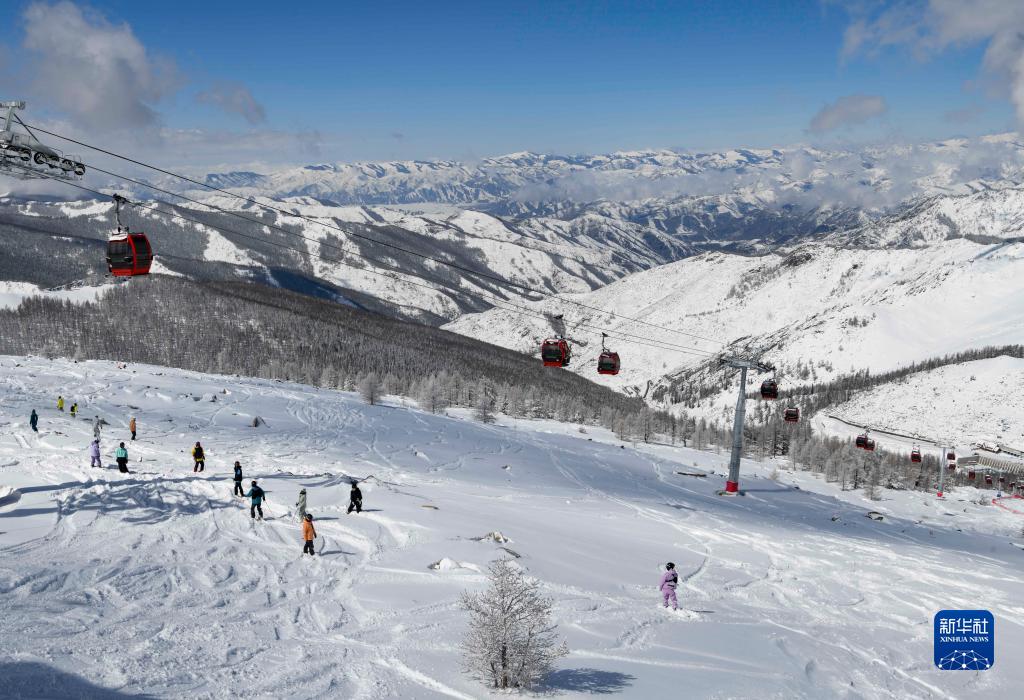 游客在新疆富蘊縣可可托海國際滑雪度假區滑雪游玩(4月9日攝)。