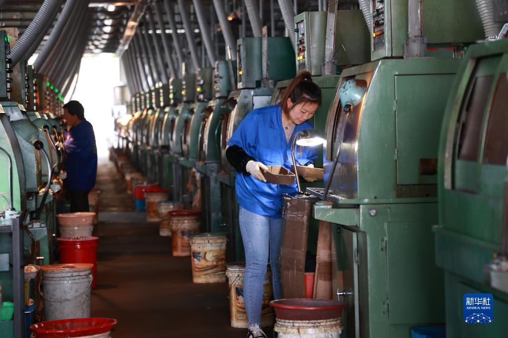4月10日,搬遷群眾在獨山縣望城社區安置點(diǎn)附近的軸承產(chǎn)業(yè)園區內生產(chǎn)軸承。