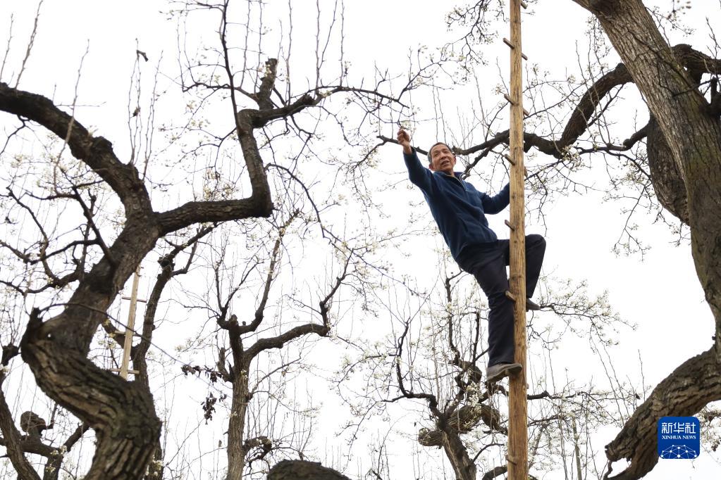 4月10日,蘭州市皋蘭縣什川鎮上車(chē)村村民在自家古梨園里為梨樹(shù)疏花。