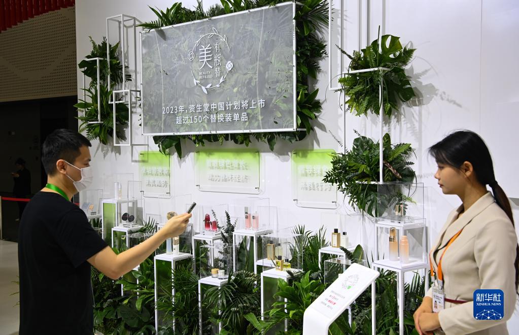 這是資生堂集團展示的明星產(chǎn)品及其替換裝組合,進(jìn)一步推動(dòng)替換裝消費趨勢,倡導綠色消費(4月11日攝)。