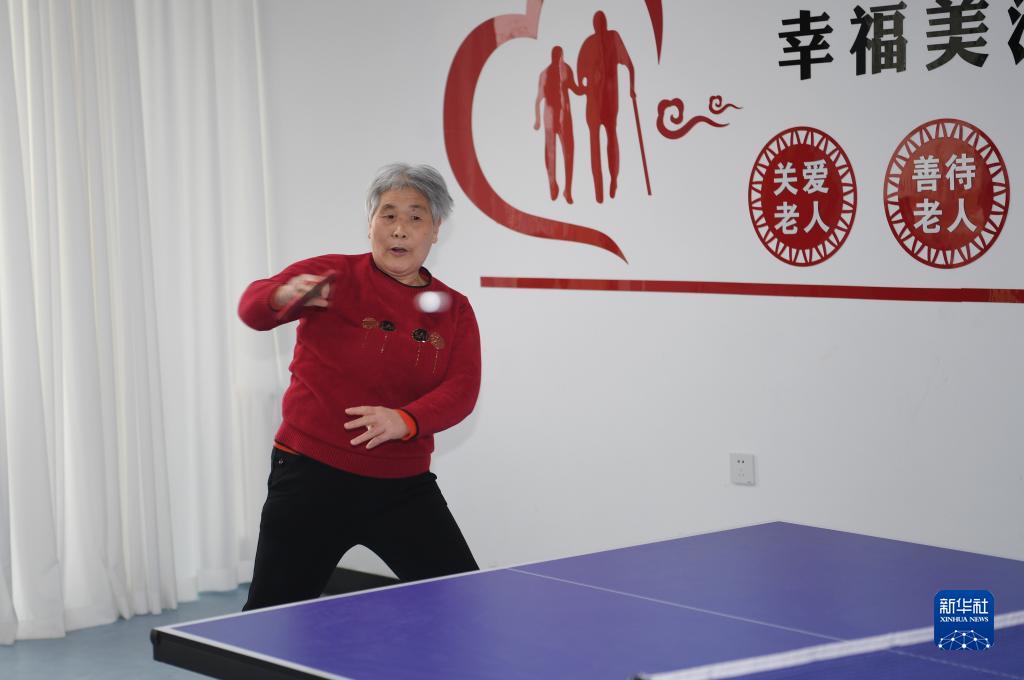 老年人在河北雄安新區容西第一養老驛站打乒乓球(4月10日攝)。