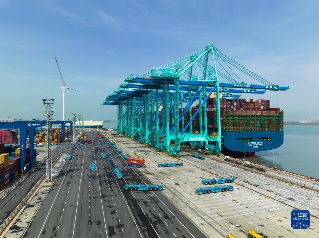 一艘貨輪靠泊在天津港“智慧零碳”碼頭進(jìn)行裝卸作業(yè)(4月6日攝,無(wú)人機照片)。