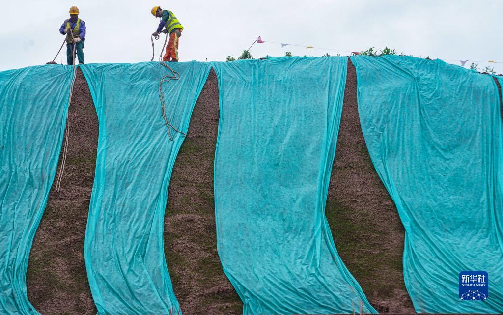 梁開(kāi)高速梁平段筑路工人在整理路段邊坡無(wú)紡布(2023年3月21日攝)。