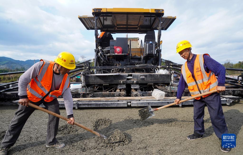 在梁開(kāi)高速梁平段施工現場(chǎng),工人在鋪設路面(2023年3月20日攝)。