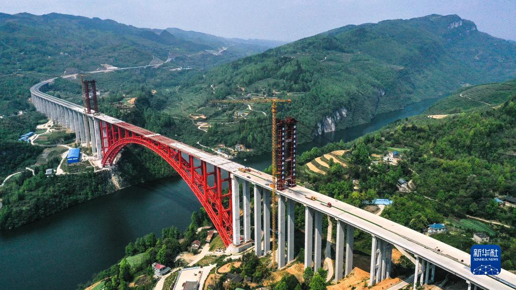 這是4月11日拍攝的德余高速烏江特大橋建設現場(chǎng)(無(wú)人機照片)。