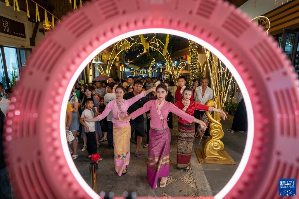 華燈初上,位于云南省德宏傣族景頗族自治州芒市的傣族古鎮逐漸熱鬧起來(lái)。作為2022年國家文化和旅游部確定的第二批國家級夜間文化和旅游消費集聚區之一,這里極具特色的少數民族建筑、服飾、舞蹈、美食吸引著(zhù)人們流連忘返。
