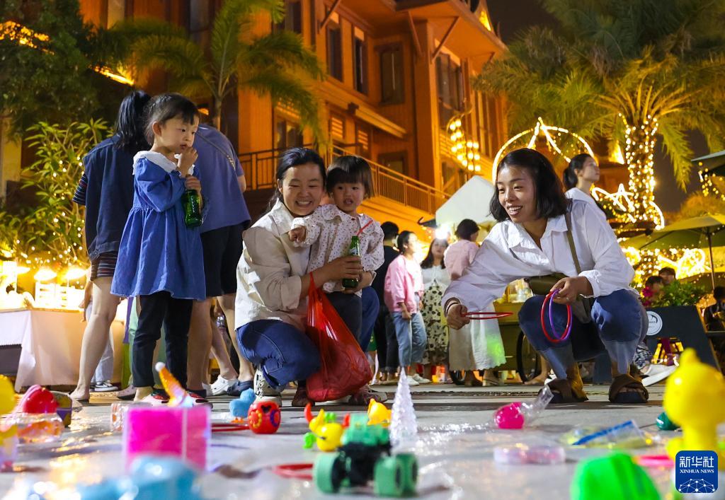 4月11日,游客在芒市傣族古鎮中玩套圈游戲。