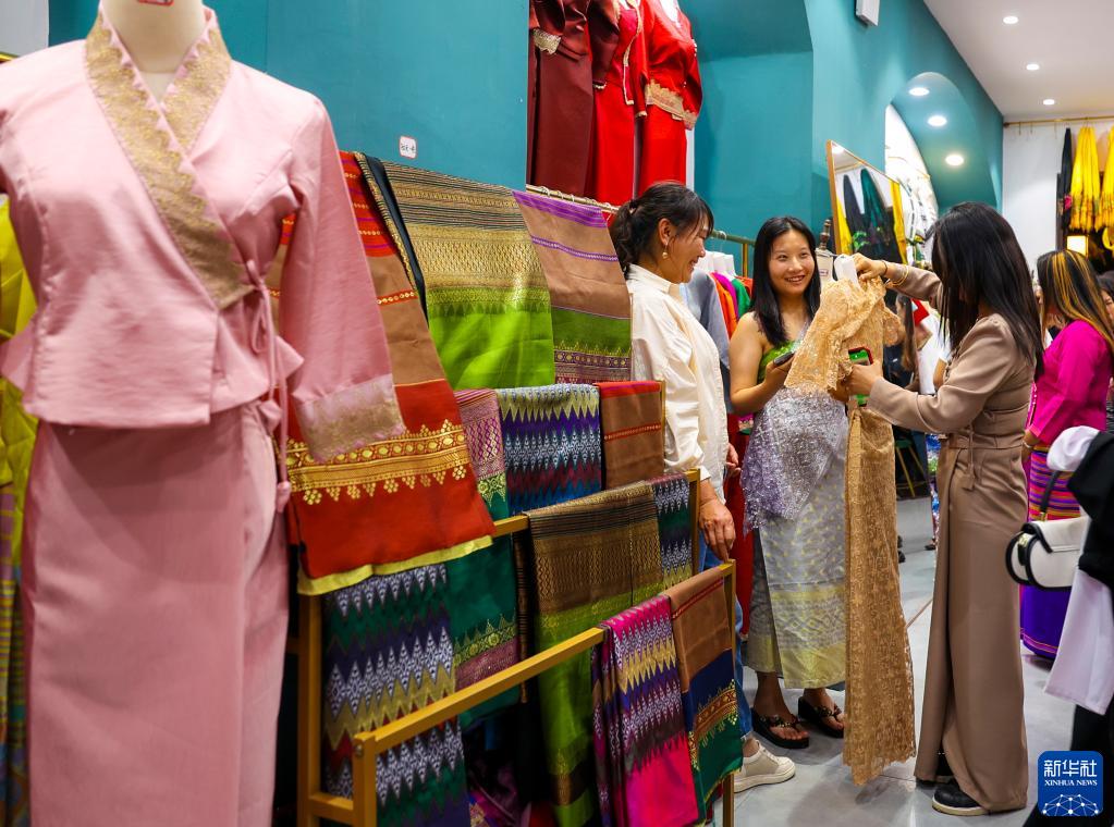 4月11日,游客在芒市傣族古鎮里選購民族服飾。