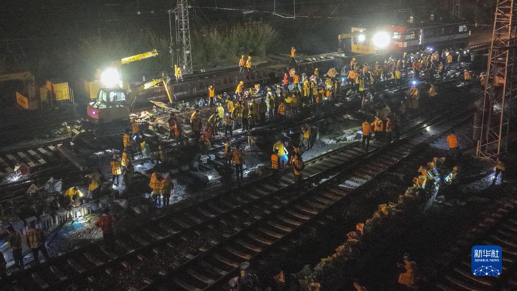 4月12日,廣西欽州港站的工人在夜間更換鐵軌(無(wú)人機照片)。