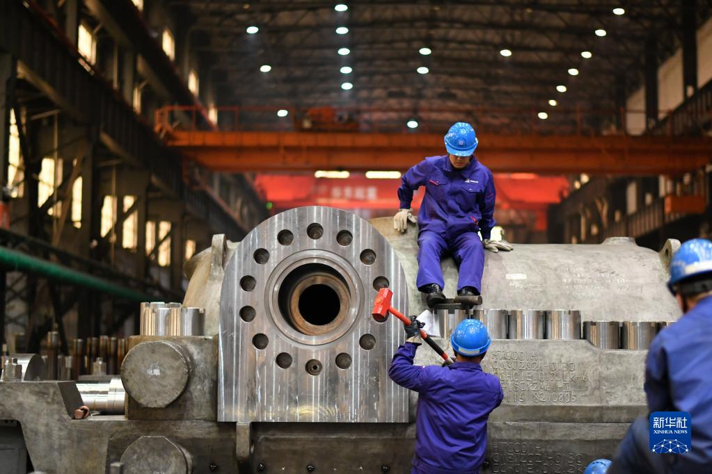 4月10日,工人在哈電集團哈爾濱汽輪機廠(chǎng)有限責任公司車(chē)間內生產(chǎn)作業(yè)。