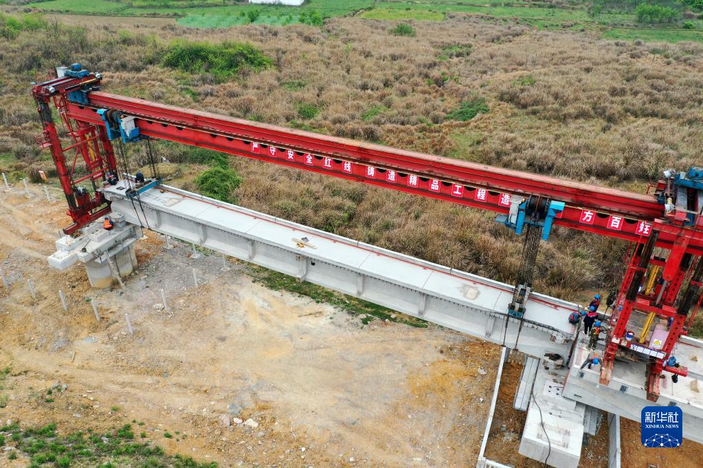 4月12日,工作人員在尖坡寨特大橋進(jìn)行預制梁架設施工(無(wú)人機照片)。