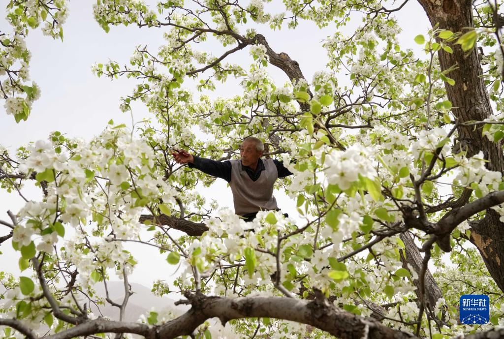 4月12日,河北省青龍滿(mǎn)族自治縣官場(chǎng)鄉山嶺高村的農民在管護旱作梯田間的安梨樹(shù)。