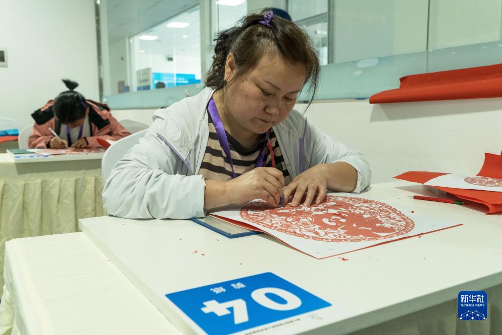 4月12日,在四川省綿陽(yáng)市公共實(shí)訓基地,參加剪紙項目的選手正在比賽中。