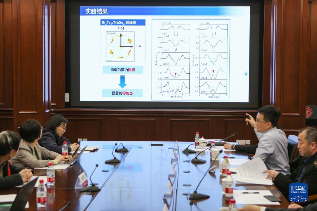 4月12日,上海交通大學(xué)物理與天文學(xué)院教授鄭浩(右排中)介紹“實(shí)驗證實(shí)超導態(tài)‘分段費米面’”成果。