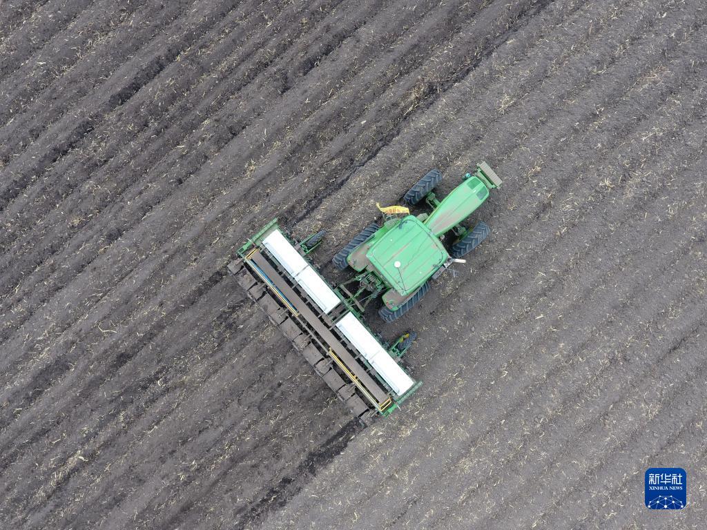 4月12日,在建設農場(chǎng)有限公司一處農田中,許志國駕駛大型拖拉機進(jìn)行分層定量施肥作業(yè)(無(wú)人機照片)。