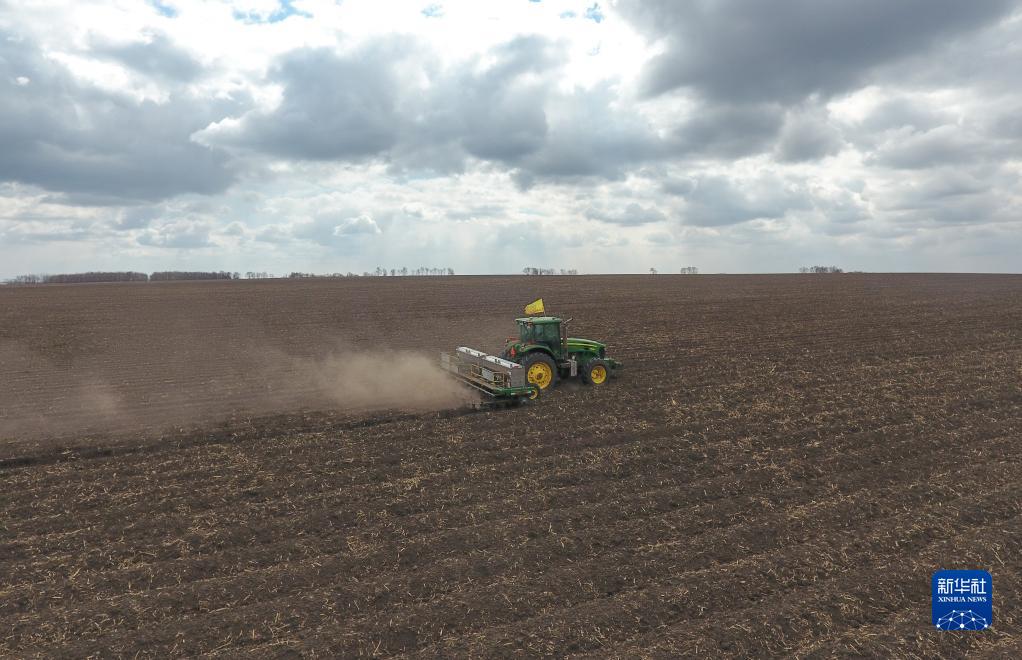 4月12日,在建設農場(chǎng)有限公司一處農田中,許志國駕駛大型拖拉機進(jìn)行分層定量施肥作業(yè)(無(wú)人機照片)。