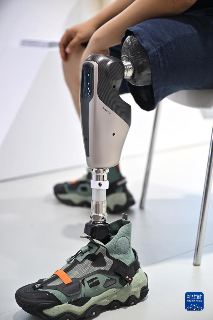 4月10日,參展商在浙江展臺展示一款智能靈巧假腿。