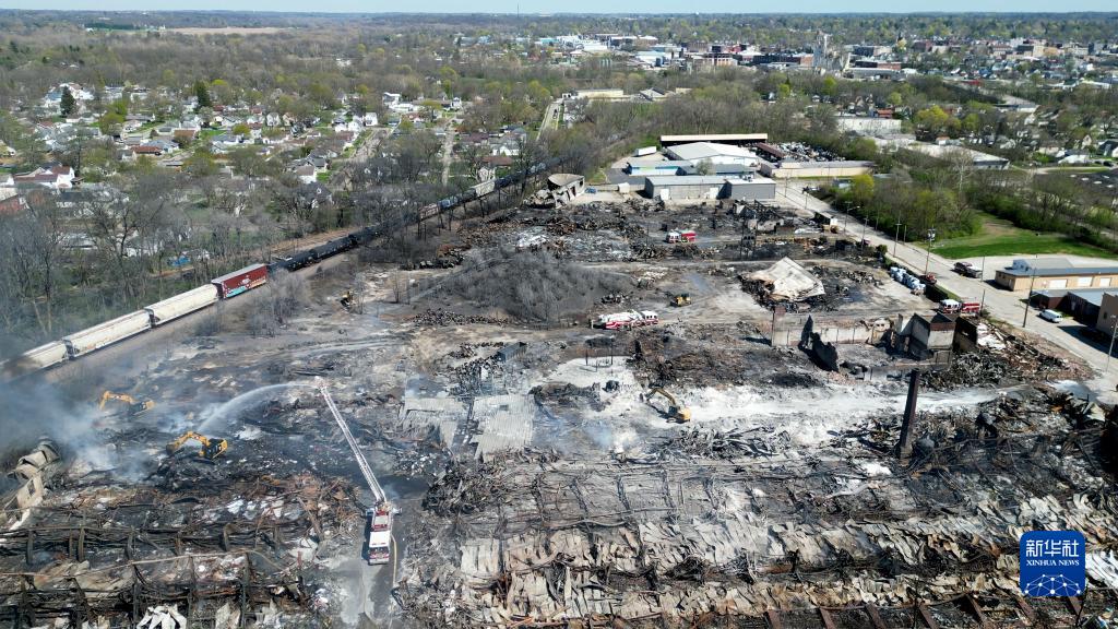 這是4月13日拍攝的美國印第安納州發(fā)生火災的回收廠(chǎng)(無(wú)人機拍攝)。