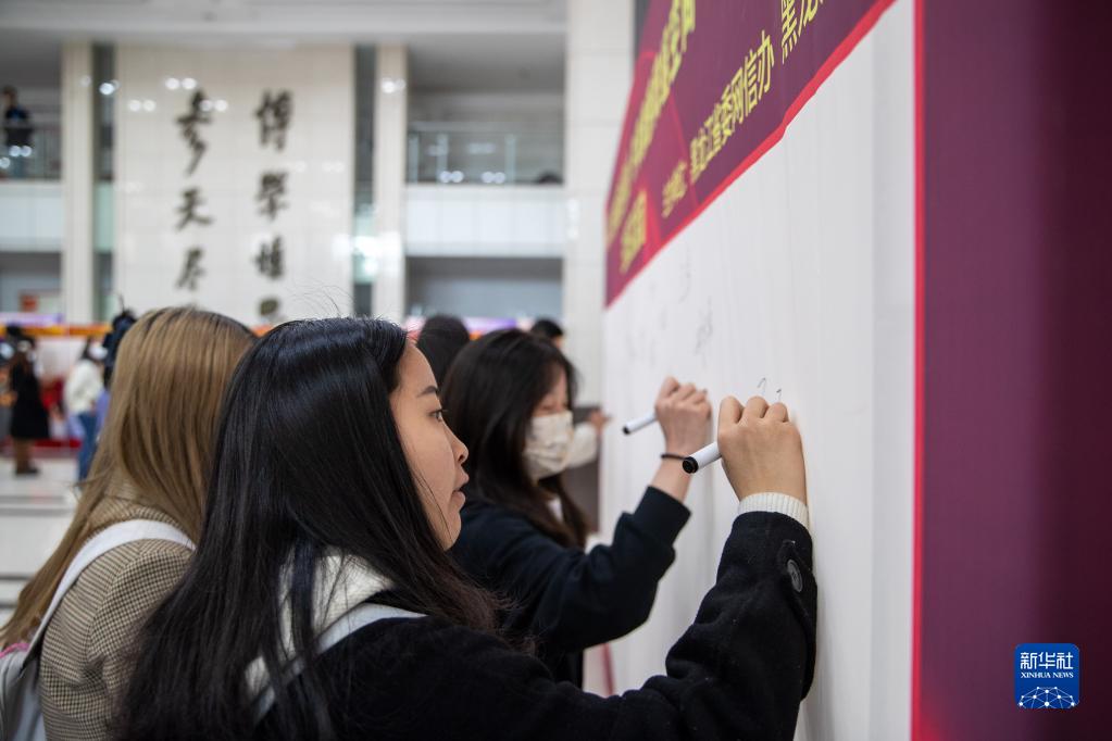 4月14日,在黑龍江大學(xué)匯文樓內,學(xué)生在全民國家安全教育日活動(dòng)中簽名。
