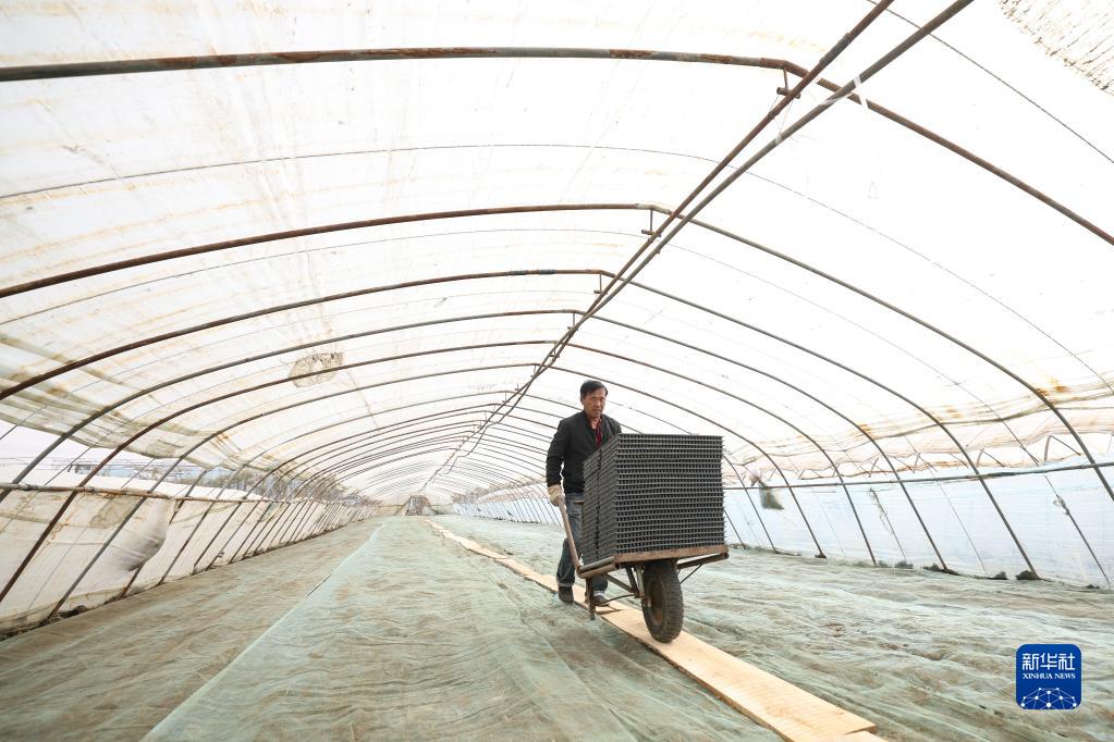 4月14日,盤(pán)錦市盤(pán)山縣的農戶(hù)在進(jìn)行水稻秧苗育苗工作。