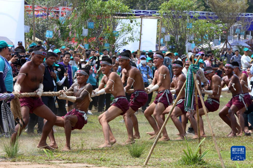 4月14日,在柬埔寨暹粒吳哥古跡內,人們在宋干節慶?;顒?dòng)上參與傳統拔河游戲。