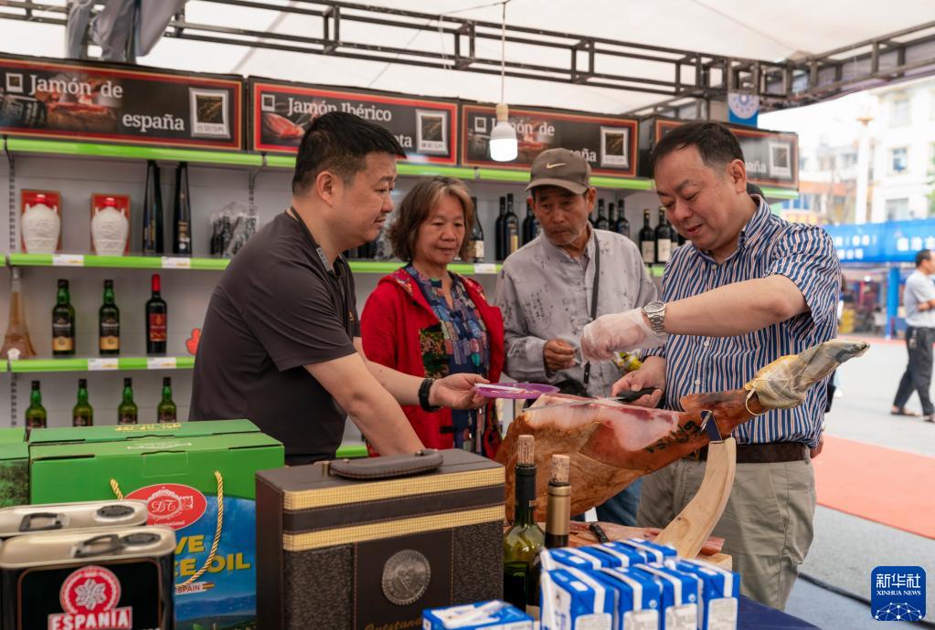 4月14日,一名參展商(右)在免稅購物節上切割西班牙進(jìn)口火腿給游客品嘗。