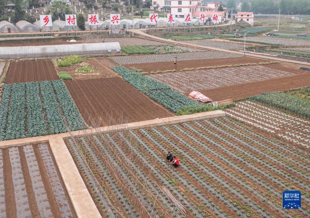 4月14日,農技工作者(身著(zhù)紅背心)在六盤(pán)水市鐘山區大河鎮大橋村和村民交流蔬菜種植情況(無(wú)人機照片)。