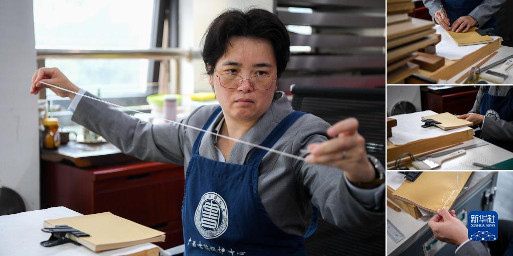 拼版照片:4月14日,在廣西壯族自治區圖書(shū)館古籍保護中心的工作室內,黃玉杏給修補好的古籍釘線(xiàn)。