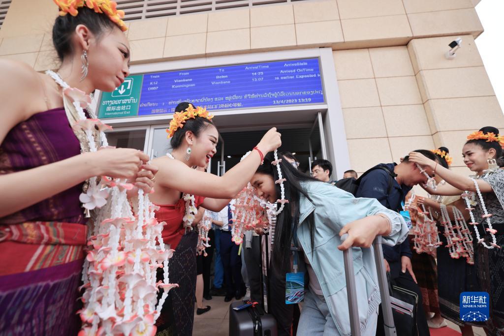 4月13日,在老撾磨丁站,工作人員歡迎乘坐D887次國際旅客列車(chē)的旅客。