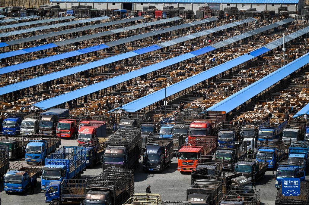 4月12日,內蒙古通遼市科爾沁左翼中旗舍伯吐鎮成峰牲畜交易市場(chǎng)里一片繁忙景象,1000余輛貨運車(chē)整齊排列,1萬(wàn)余頭黃牛正等待被交易。據介紹,這個(gè)交易市場(chǎng)年交易80萬(wàn)頭肉牛,交易額可達80億元。今年以來(lái),當地牛市行情逐漸轉好,來(lái)自遼寧、吉林、山東等地的買(mǎi)家再次聚集于此,帶動(dòng)了養殖戶(hù)增收。