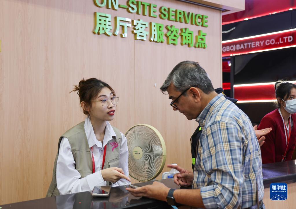 4月15日,廣交會(huì )服務(wù)人員在展館為來(lái)賓提供咨詢(xún)。