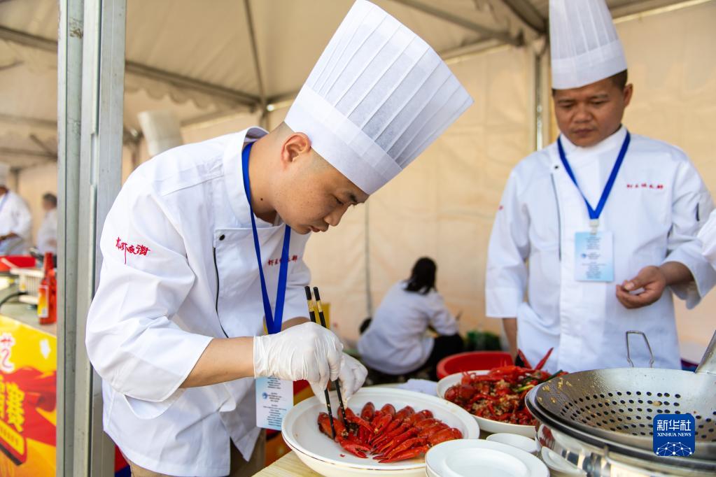 4月16日,在益陽(yáng)市南縣南洲廣場(chǎng),廚師們在進(jìn)行烹飪小龍蝦廚藝比拼。