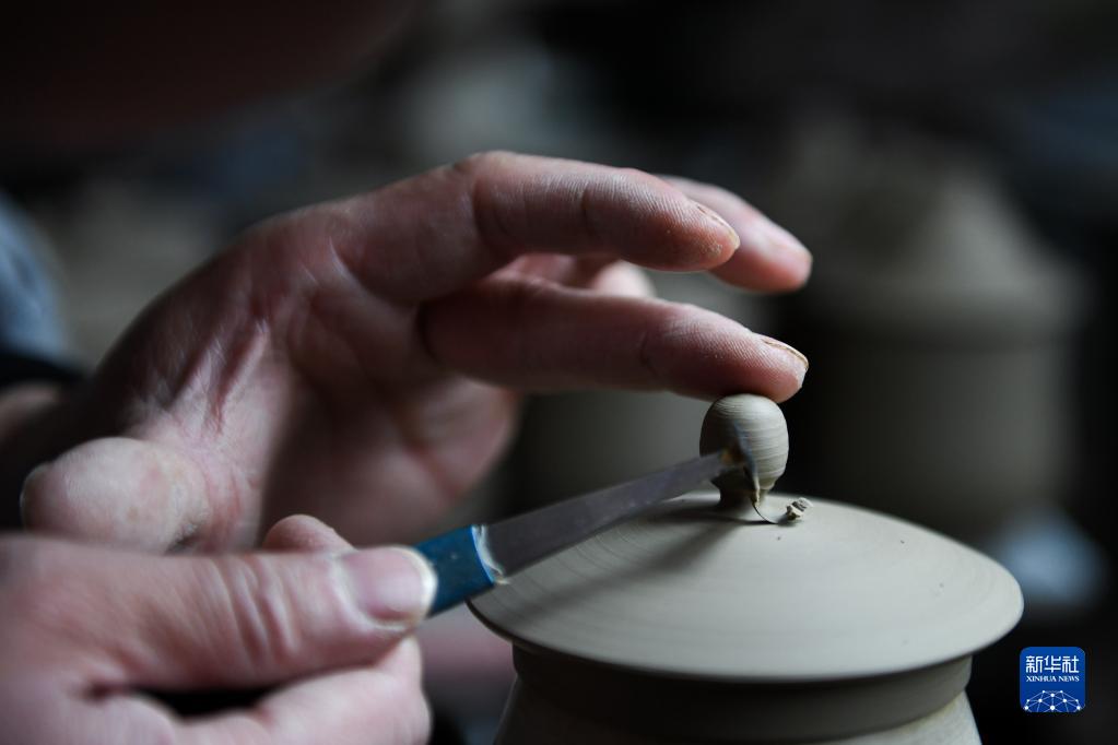 4月14日,在河南省汝州市一家汝瓷生產(chǎn)車(chē)間內,工人在修坯。