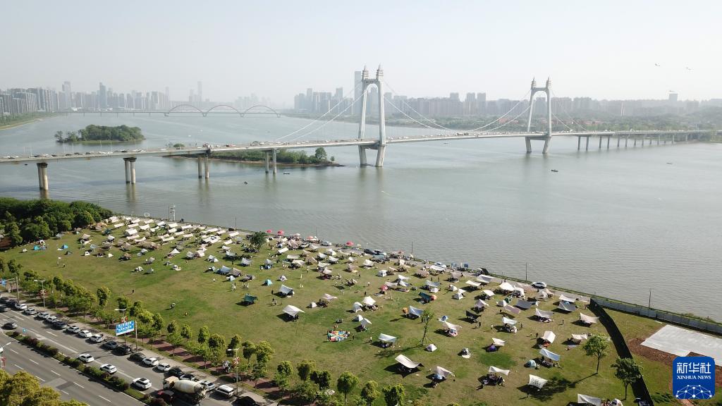 4月16日,市民在長(cháng)沙市開(kāi)福區湘江畔露營(yíng)休閑(無(wú)人機照片)。