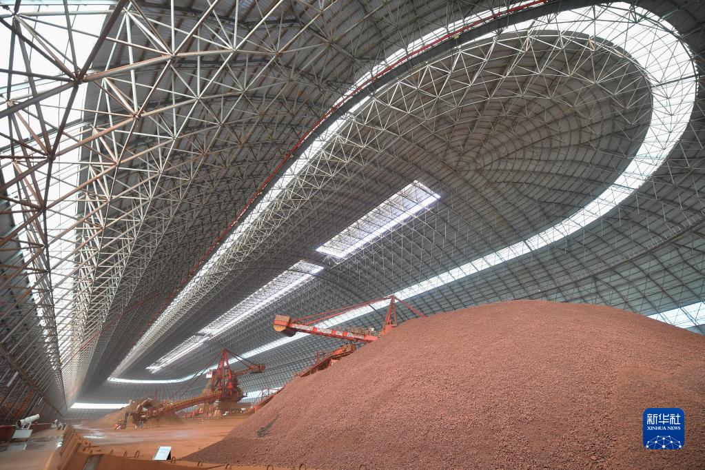 4月17日拍攝的湖南省岳陽(yáng)市城陵磯港“膠囊”形散貨大棚內景。